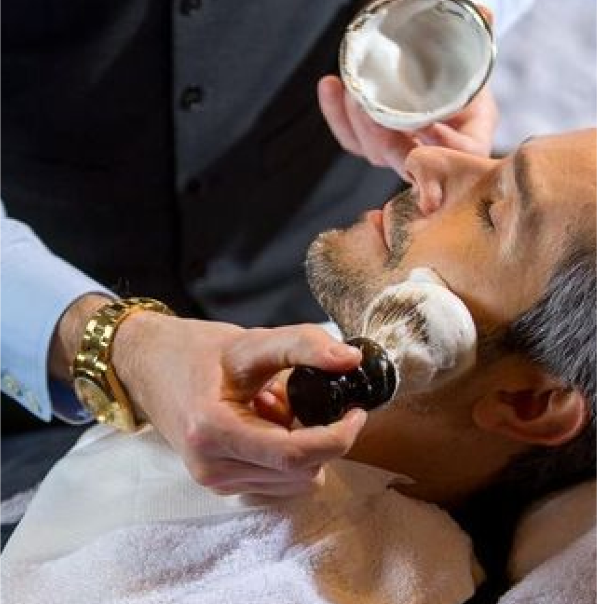 A hot towel shave includes applying a warm towel to soften facial hair and open pores before shaving. This process ensures smoother blade movement, reduced irritation and a closer, more comfortable shave.